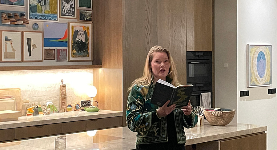 Að lokum las Ester Hilmarsdóttir upp úr skáldsögunni Sjáandi, þar sem ástin og tengsl mannsins við náttúruna eru í forgrunni á tímum sveitarsíma og förukvenna. Ester er fædd í Aðaldal í Suður-Þingeyjarsýslu árið 1985 og hefur víðtækan bakgrunn í ritstörfum, ritstjórn og textavinnu bæði hérlendis og erlendis. Fyrsta bók hennar, Fegurðin í flæðinu, kom út árið 2023 og hlaut tilnefningu til Fjöruverðlaunanna 2024.