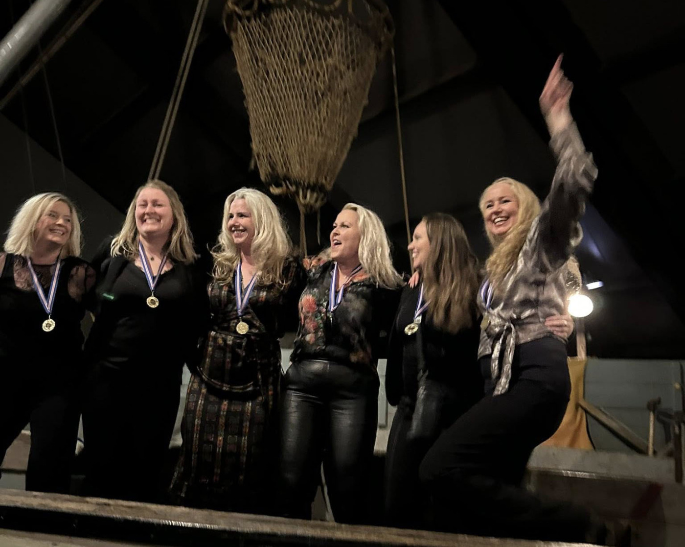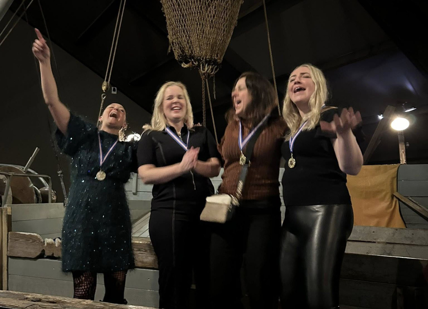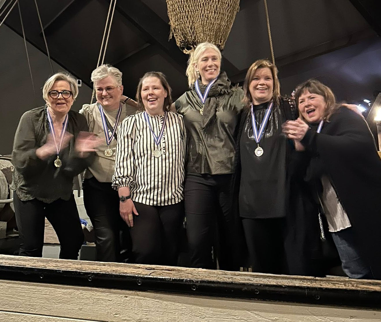 Þessir hressu keppendur létu allt vaða í fögnuðinum. Gullið um hálsinn og buxurnar á hælunum, svona á að taka á móti sigri.
