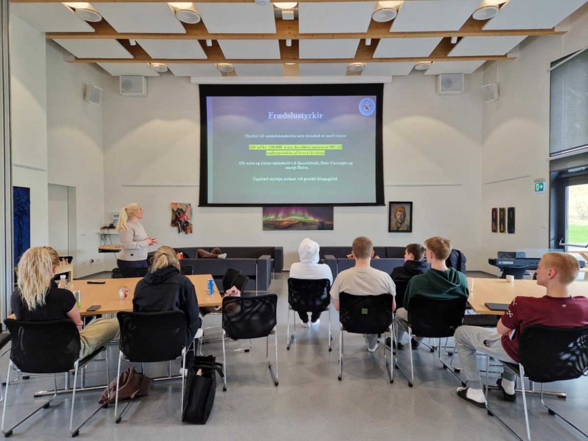 Í þetta sinn var það Rut Pétursdóttir, mannauðs- og fræðslustjóri félagsins, sem sá um kynninguna. Voru nemendur áhugasamir og spurðu út í eitt og annað enda margir þeirra í vinnu með skóla og svo eru sumarstörfin á næsta leiti.