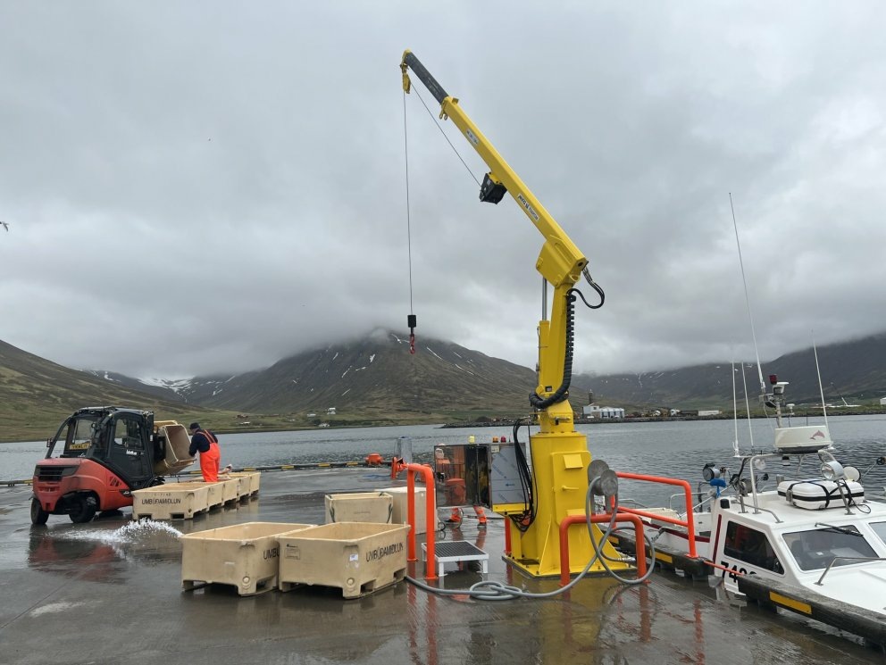 Kraninn lyftir um 1250 kílóum í lengstu stöðu sem eru sjö metrar og er fjarstýrður, hægt að stjórna honum hvar sem er á bryggjunni.