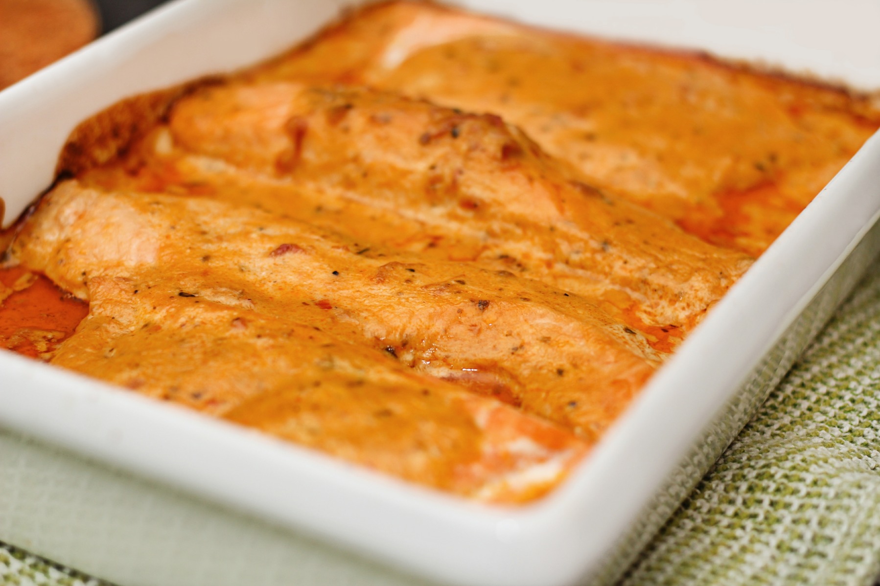 Hitið ofninn í 180°. Leggið laxinn í eldfast mót.  Setjið rjóma, sýrðan rjóma, fiskkraft og rautt pestó í pott og hitið að suðu. Látið sjóða saman í nokkrar mínútur og smakkið til með salti og pipar. Hellið sósunni yfir laxinn og setjið í ofninn í 25 mínútur.