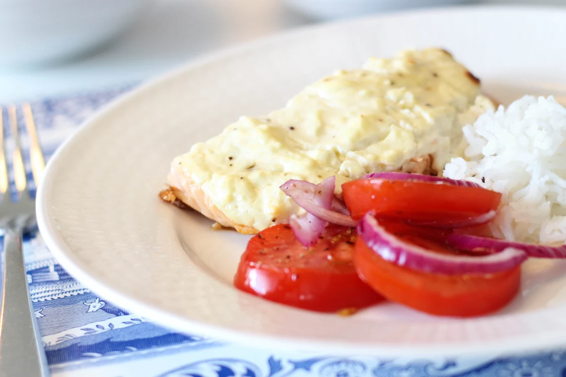Hitið ofn í 220°. Leggið laxinn í eldfast mót. Hrærið saman sýrðum rjóma, fetaosti, fiskiteningi og sítrónupipar og setjið blönduna yfir laxinn. Setjið í ofninn, eftir 15-20 mínútur er slökkt á honum en laxinn tekinn út þegar 30 mínútur eru liðnar.