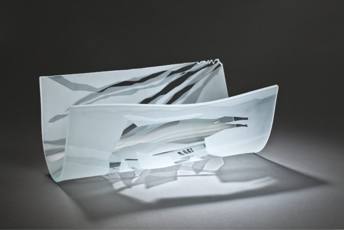 Ég gerði verkefni um snjóflóðavarnir og arkitektúr, sem einkennir byggðina þarna. En minningar spruttu fram í skissum, um fantasíur og þjóðsögur frá barnæskunni. Verkin eru unnin í plangler og ljósmyndum með sandblásnum grafíkmynstrum.