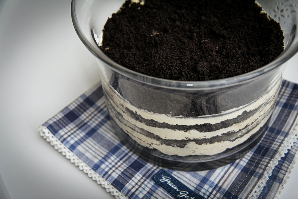 Setjið til skiptist í skál oreokex og ostakökublönduna, endið á kexinu.