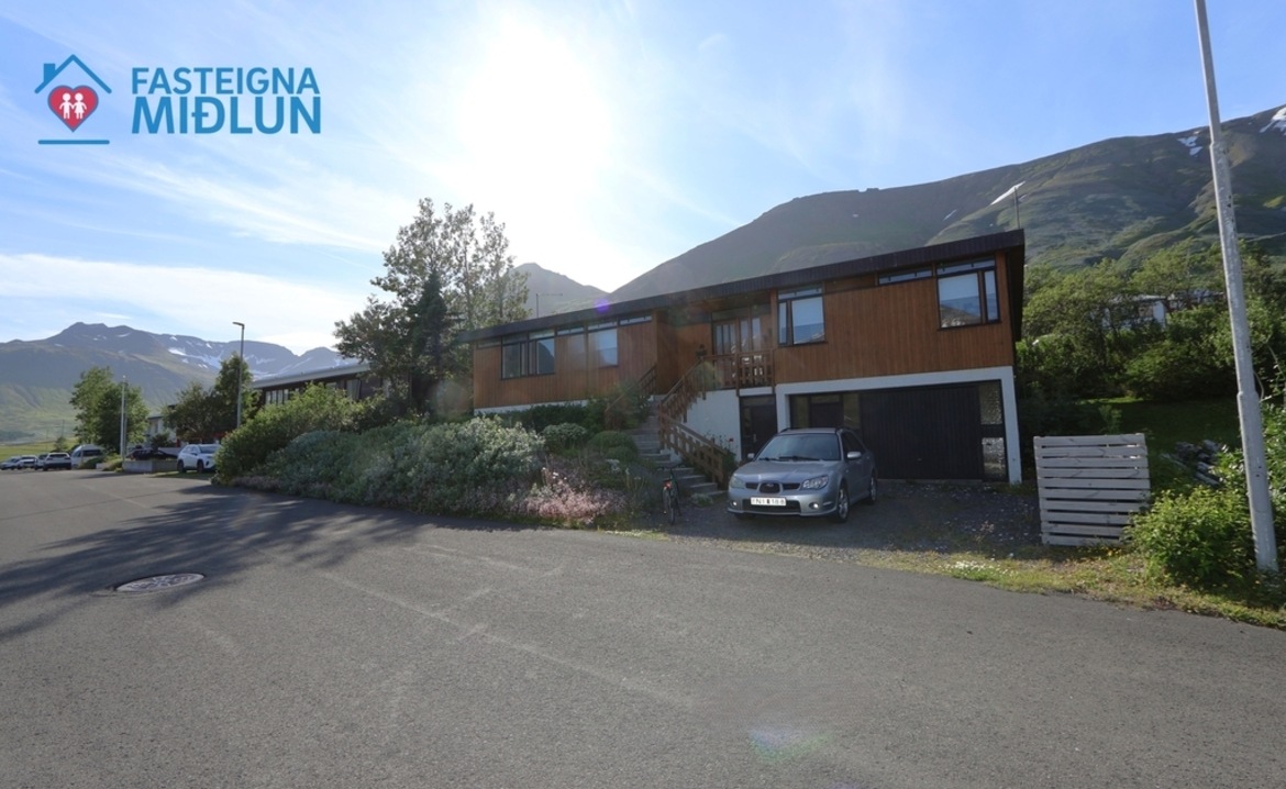 Um er að ræða einbýlishús með stórum garði og frábæru útsýni og skjólgóðum grónum garði. Eignin skiptist í efri og neðri hæð með bílskúr. Efri hæð samanstendur af stofu, eldhúsi, tveimur baðherbergjum, þvottahúsi, fimm svefnherbergjum og andyri. Stofa/borðstofa er mjög rúmgóð með miklu gluggaplássi og sérútgang út á pall í garði. Eldhús liggur við stofu með léttum vegg á milli. Einnig er aflokað búr/geymsla með glugga og opnanlegu fagi inn af eldhúsi með léttum vegg. Þvottahús er með sérútgang og glugga með opnanlegu fagi. Hjónaherbergi er með sérútgang út í garð. Neðri hæð eignarinnar býður upp á marga möguleika og er að hluta til óklárað en grafið var út úr kjallara og jarðvegur lagður og járnabundinn en eftir á að steypa gólf að hluta. Neðri hæð samanstendur því að bílskúr og geymslu í dag. Sérútbúin geymsla er með sérinngang sem hugsuð var fyrir sorpgeymslu við hlið bílskúrs.