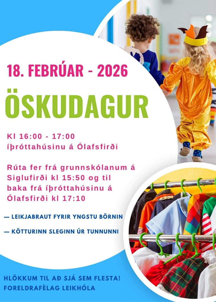 Öskudagshátíð verður haldin í Íþróttahúsinu í Ólafsfirði í dag miðvikudaginn 18. febrúar 2026 frá klukkan 16:00 til 17:00. Viðburðurinn er ætlaður yngstu börnunum og fjölskyldum þeirra.