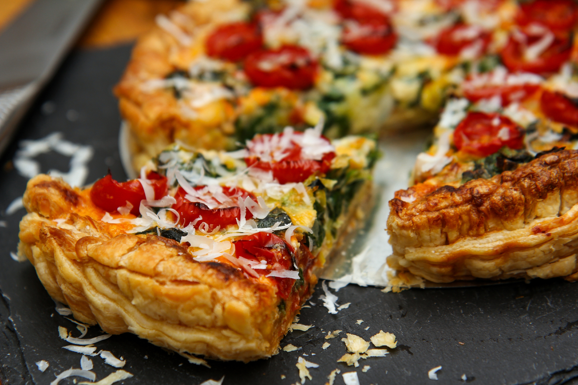 Setjið púrrulauk, spínat og rifinn parmesanost í bökuskelina. Hrærið egg og rjóma saman og kryddið með salti og pipar. Hellið hrærunni yfir fyllinguna og toppið með hálfum kirsuberjatómötum.