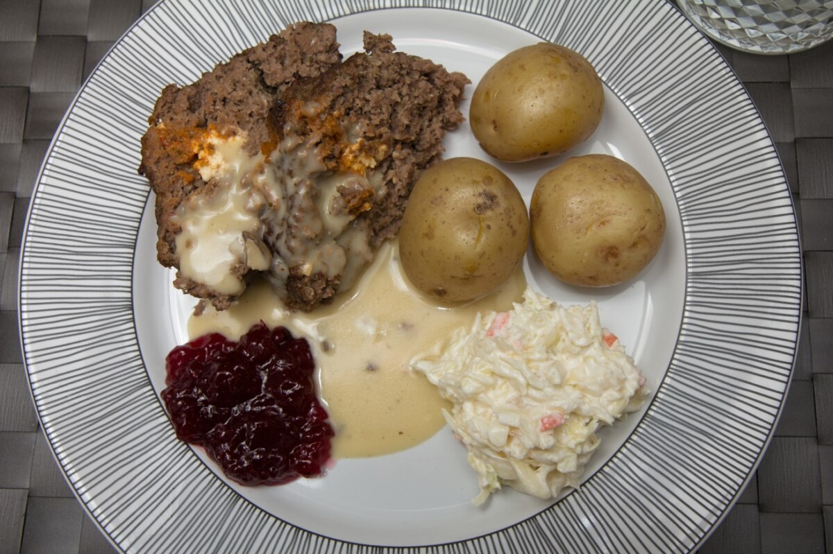 Blandið maukinu og hakkinu vel saman. Smyrjið eldfast mót, formið hleif úr hakkblöndunni og leggið hann í mótið. Gerið skurð í kjöthleifinn. Myljið fetaost í skurðinn og setjið pestó yfir.