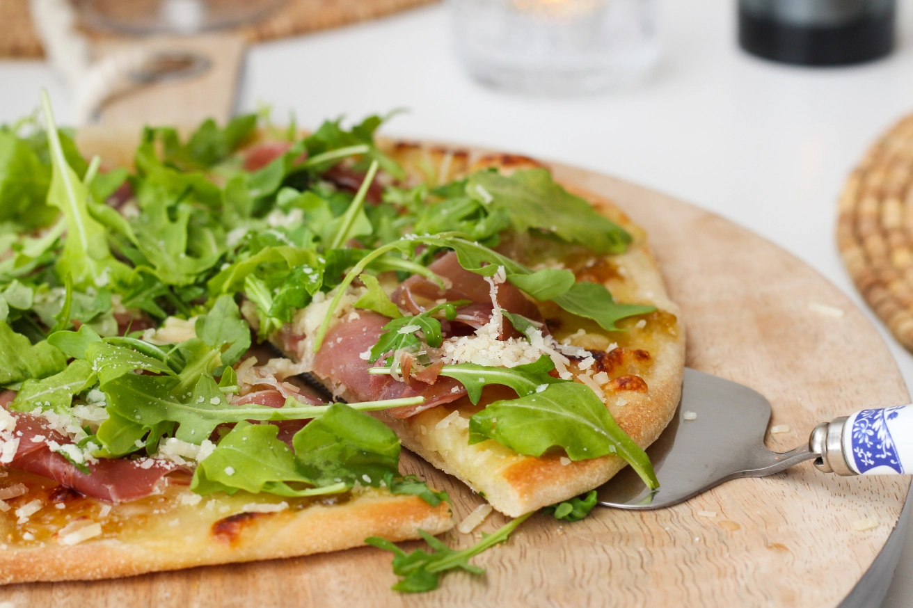 Pizza með fíkjusultu, hráskinku, ruccola og parmesan