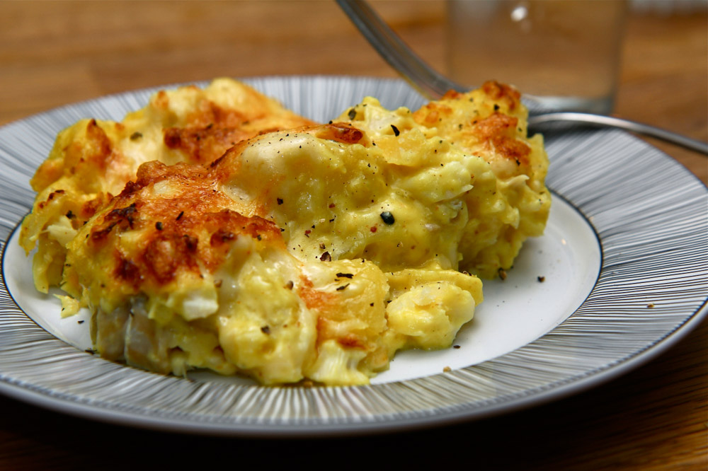 Setjið blönduna í eldfast mót. Hrærið sinnepi saman við rifinn ost og stráið yfir plokkfiskinn. Bakið í 10 mínútur eða þar til osturinn hefur bráðnað. Berið fram með rúgbrauði.