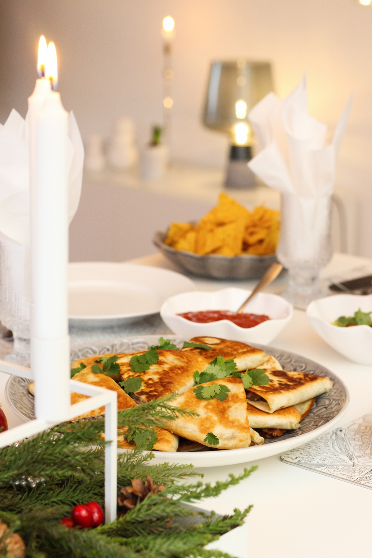 Leggið tortillakökurnar á borð og dreifið fyllingunni yfir helminginn á hverri köku. Setjið salsa, mulið nachos og rifinn ost yfir. Brjótið tortillukökuna saman í hálfmána og steikið í olíu á hvorri hlið þar til kakan er stökk og osturinn bráðnaður. Skerið í sneiðar og berið fram.