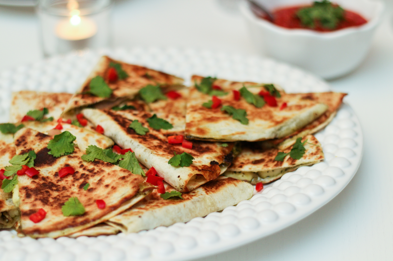 Smyrjið tortillaköku með pestói. Setjið fetaost, parmesanost, ferska basiliku, hakkað chili (sleppið fræjunum ef þið viljið ekki hafa þetta sterkt) og parmaskinku yfir helminginn og brjótið svo tortillakökuna saman, þannig að hún myndi hálfmána. Steikið á pönnu á báðum hliðum og þrýstið aðeins á tortilluna svo osturinn bráðni.