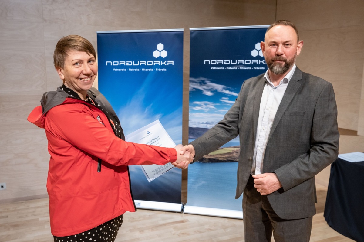 Á myndinni sést Sóley Björk verkefnastjóri taka við styrknum úr hendi Eyþórs Björnssonar forstjóra Norðurorku.