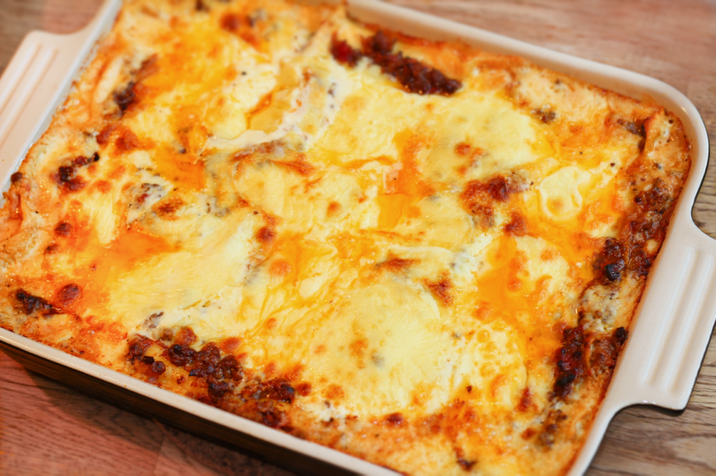 Hitið ofninn í 180°. Steikið hakkið, laukinn og hvítlaukinn á pönnu upp úr smjörinu. Bætið niðursoðnu tómötunum, chilisósunni, teningi, salti og pipar á pönnuna og látið sjóða við vægan hita á meðan ostasósan er gerð.