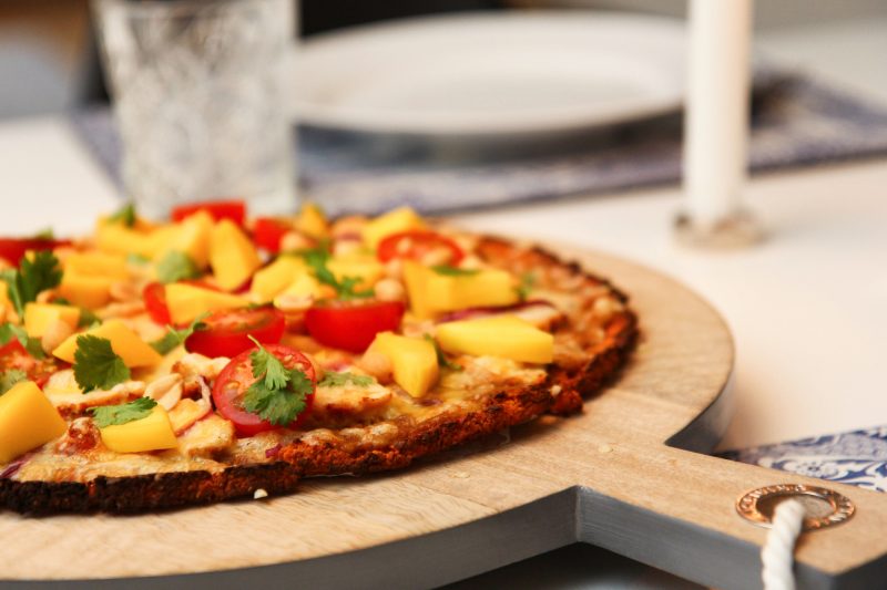 Setjið blönduna á bökunarpappírsklædda bökunarplötu og mótið pizzabotn sem er 0,5 – 1 cm á þykkt. Bakið í 25-30 mínútur, eða þar til botninn er þurr viðkomu.