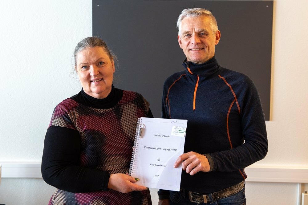 Á myndinni má sjá menningarfulltrúa skólans, Þórarinn Hannesson, færa Láru Stefánsdóttur, skólameistara heftið góða fyrir hönd Elíasar.
