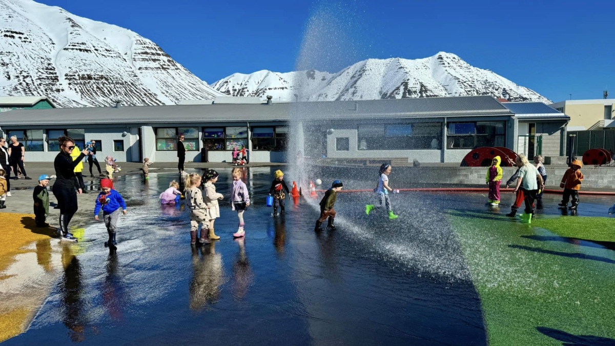 Krakkarnir á leikskólanum Leikhólum Ólafsfirði fengu aðstoð slökkviliðs Fjallabyggðar við að kæla sig niður í hitanum og blíðviðrinu fimmtudaginn 13. júní.