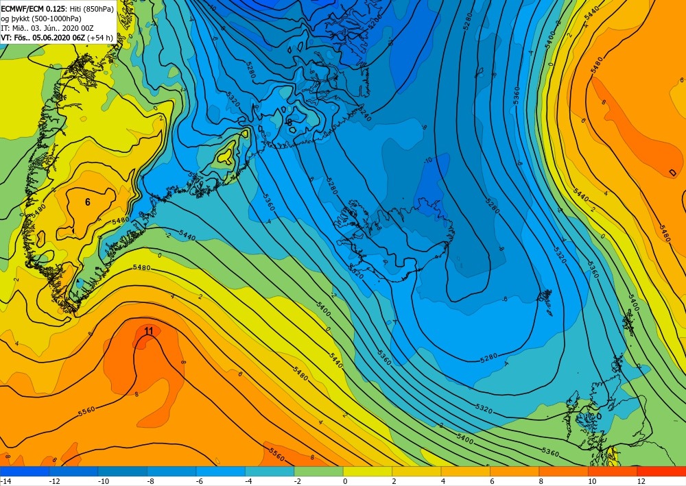 Spákortið sem fylgir sýnir þykktina og hita í 850hPa fletinum á föstudagsmorgun. 5240m gefur til kynna frost og -10°C er spáð í 1.300 m hæð norðaustanlands.