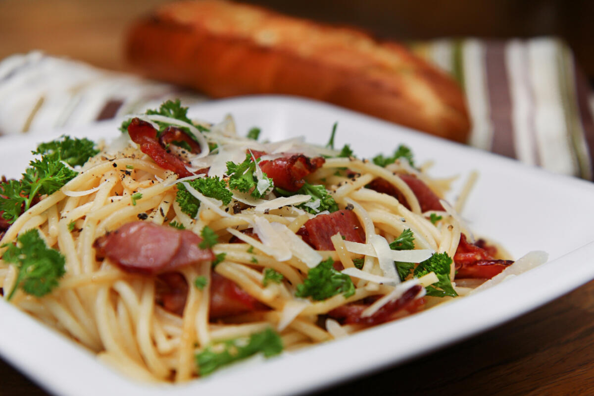 Spaghettí með ofnbökuðu beikoni í hvítlauksolíu