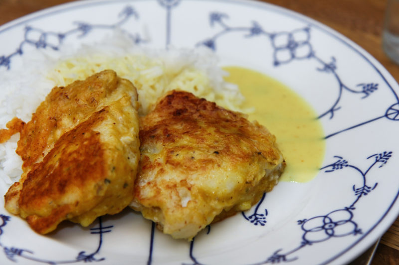 Steikið fiskinn á pönnu og berið hann fram með hrísgrjónum og karrýsósu.