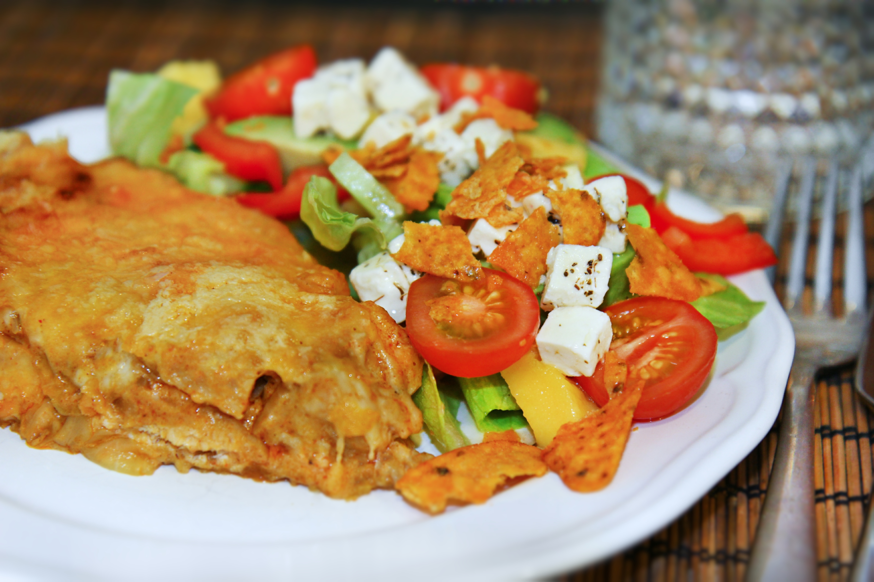Þrýstið bökudeiginu í formið og forbakið í ca 10 mínútur við 200°. Hellið kjúklingahrærunni í og stráið ostinum yfir. Bakið við 225° í ca 25 mínútur. Berið fram með góðu salati. Í kvöld var ég með iceberg (skerið kálið niður og látið það liggja í ísköldu vatni, kálið verður brakandi stökkt og gott), rauða papriku, mangó, avókadó, gúrku, rauðlauk, fetaost og mulið nachos. Sjúklega gott.