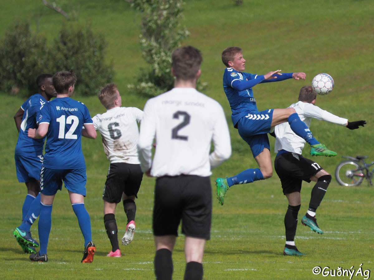 KFG jafnaði metin í 2-2 á 60. mínútu en þá tók Björn Andri Ingólfsson málin í sínar hendur. Hann kom KF yfir á 67. mínútu og bætti við þremur mörkum til viðbótar áður en leiknum lauk. Þess má geta að Björn Andri var aðeins með eitt mark í meistaraflokki fyrir leikinn gegn KFG í dag samkvæmt heimasíðu KSÍ.