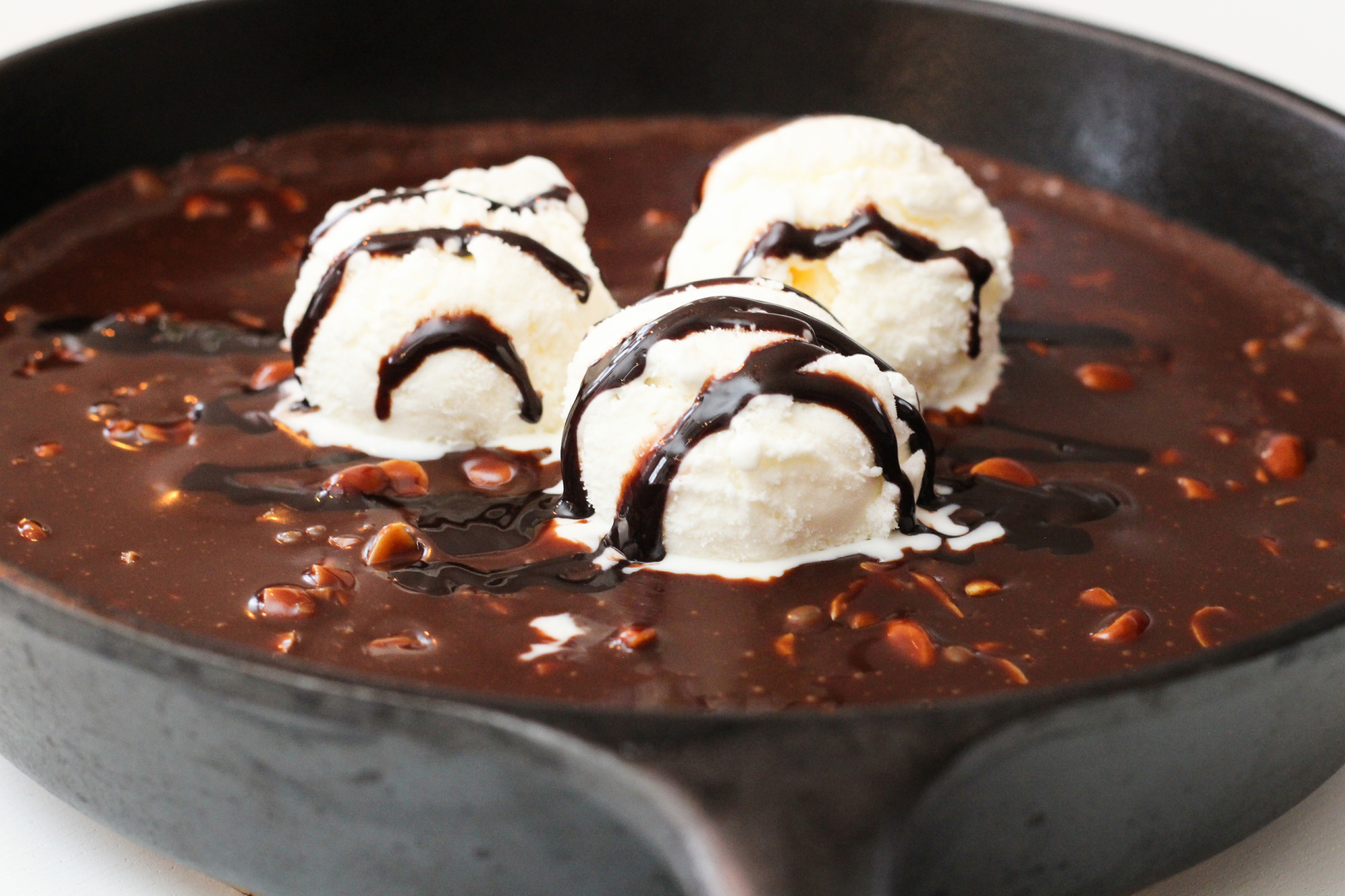Bræðið súkkulaði og rjómi saman í potti. Hellið blöndunni yfir kökuna þegar hún kemur úr ofninum. Látið standa í smá stund (þannig að mesti hitinn rjúki úr henni) en berið kökuna fram meðan hún er ennþá heit/volg með ís og jafnvel auka súkkulaðisósu.
