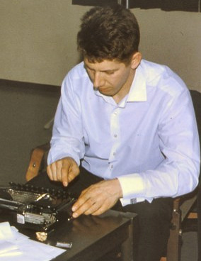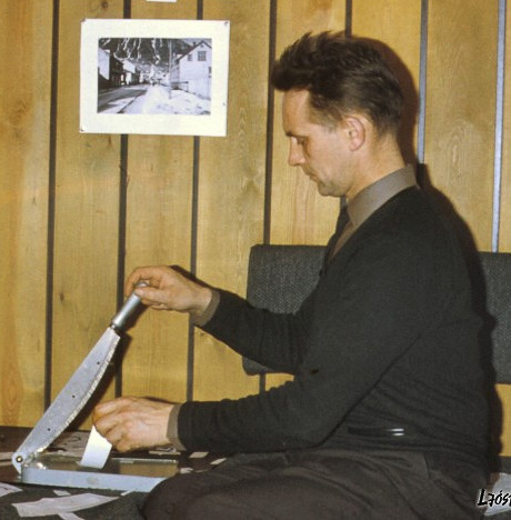 Steingrímur að skrifa upplýsingar á “ritvél” um myndir með einum putta og Júlli Júll er að skera ljósmyndir í undirbúningsvinnu fyrir krakka ljósmyndasýningu í Æskó. Ljósmyndari óþekktur.