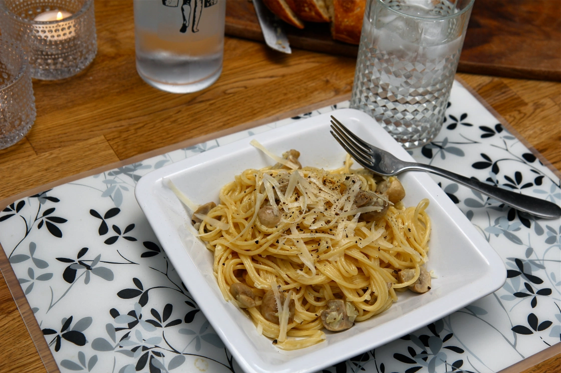 Hellið vatninu af spaghettíinu (geymið ca ½ bolla af vatninu) og blandið spaghettíinu saman við sveppasósuna. Setjið smá af spaghettívatninu saman við og hrærið vel saman.
