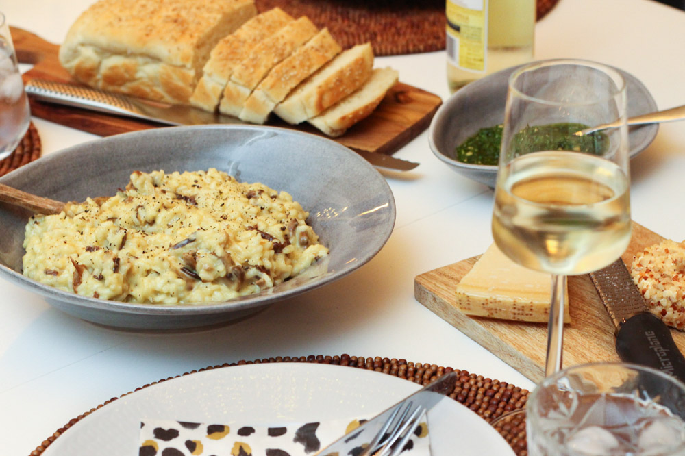 Brúnið laukinn létt í potti eða pönnu og setjið grjónin svo út í ásamt kjúklingasoðinu og sjóðið þar til þau verða léttelduð eða í um 10 mínútur. Brúnið næst sveppina á sér pönnu og setjið svo út í grjónin ásamt rjómanum og rifnum parmesan. Smakkið til með salti og pipar.