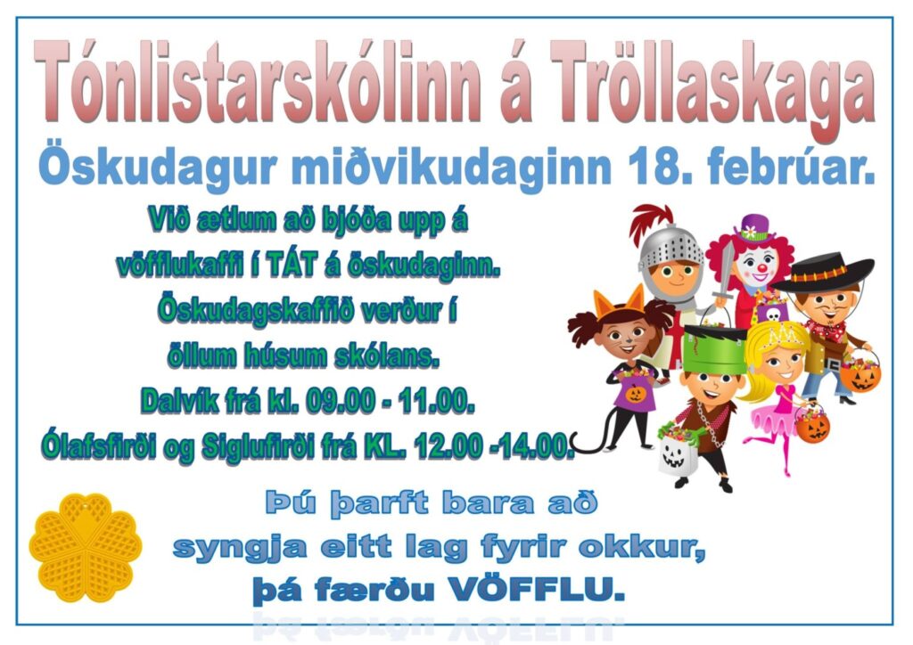 Tónlistarskólinn á Tröllaskaga býður upp á vöfflukaffi í tilefni öskudags, miðvikudaginn 18. febrúar. Boðið verður upp á öskudagskaffi í öllum húsum skólans.