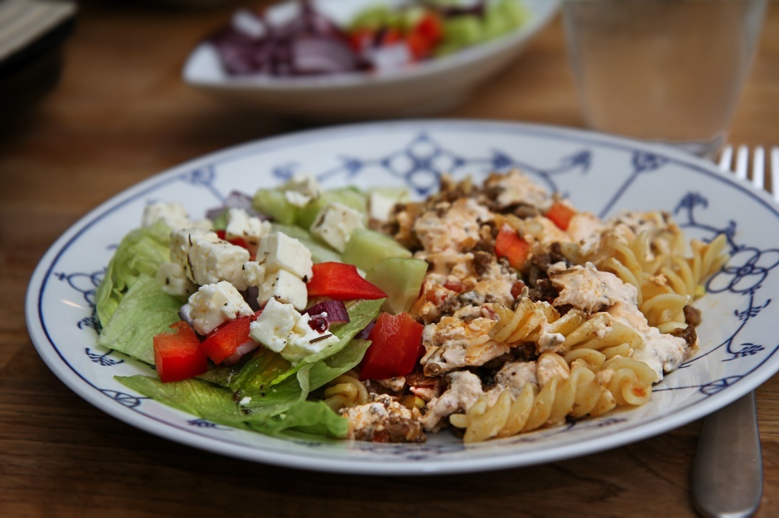 Setjið pastað í botninn á eldföstu móti, setjið nautahakkshræruna yfir og að lokum sósuna. Eldið í 200° heitum ofni í 10-15 mínútur.