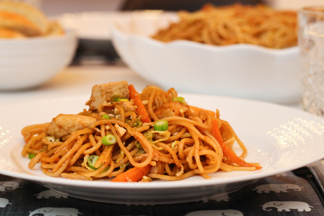Þurrkið pottinn og setjið 1 msk af sesamolíu í hann. Setjið vorlauk (takið fyrst smá af honum frá til að setja yfir réttinn sem skraut), gulrætur, kínakál, kjúkling, hvítlauk og engifer í pottinn. Steikið í 1-2 mínútur og bætið þá hunangi, hnetusmjöri, sojasósu, ediki og Sriracha sósu í pottinn. Hærið öllu vel saman og bætið að lokum spaghettíinu í pottinn. Blandið öllu vel saman. Skreytið með vorlauk og berið fram.