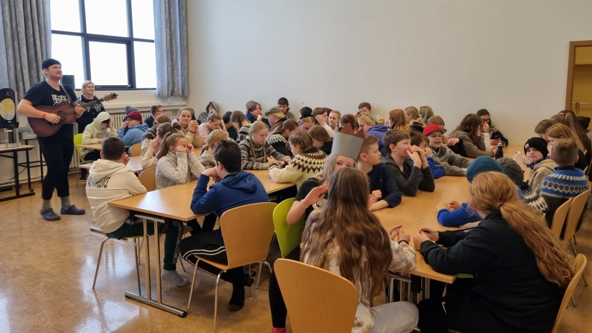 Guðmann mætti með gítarinn og hélt uppi fjörinu þar sem sungin voru m.a. þorralög og tóku nemendur og starfsfólk undir.