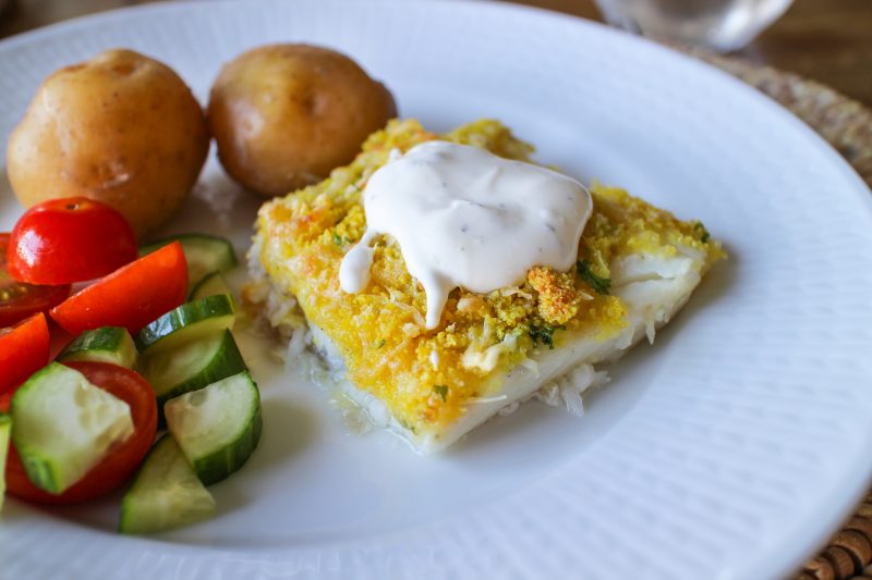 Hitið ofninn í 150°. Leggið fiskinn í smurt eldfast mót. Saltið og piprið. Blandið raspi, rifnum osti, steinselju og pressuðu hvítlauksrifi saman og setjið yfir fiskinn.