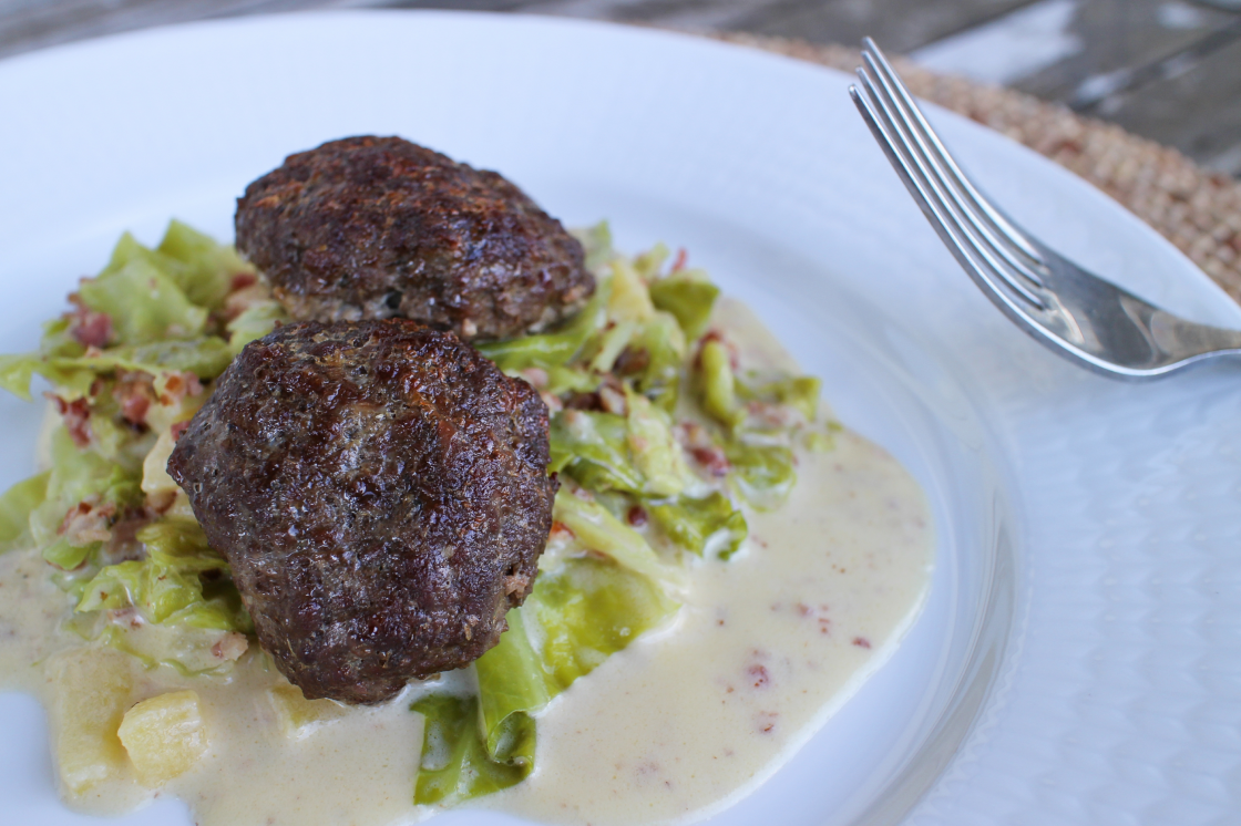 Steikið beikon í rúmgóðum potti. Skerið savoykálið (um 8 kálblöð, ekki nota grófustu blöðin) í strimla og bætið í pottinn með beikoninu. Steikið áfram í smá stund og stráið síðan smá hveiti yfir áður en 2,5 dl af rjóma er hellt yfir. Ef blandan verður of þykk þá er hún þynnt með smá vatni. Skerið eplið í teninga og bætið í. Saltið og piprið eftir smekk (athugið að fara varlega í saltið út af beikoninu). Látið sjóða í nokkrar mínútur eða þar til kálið er orðið mjúkt.