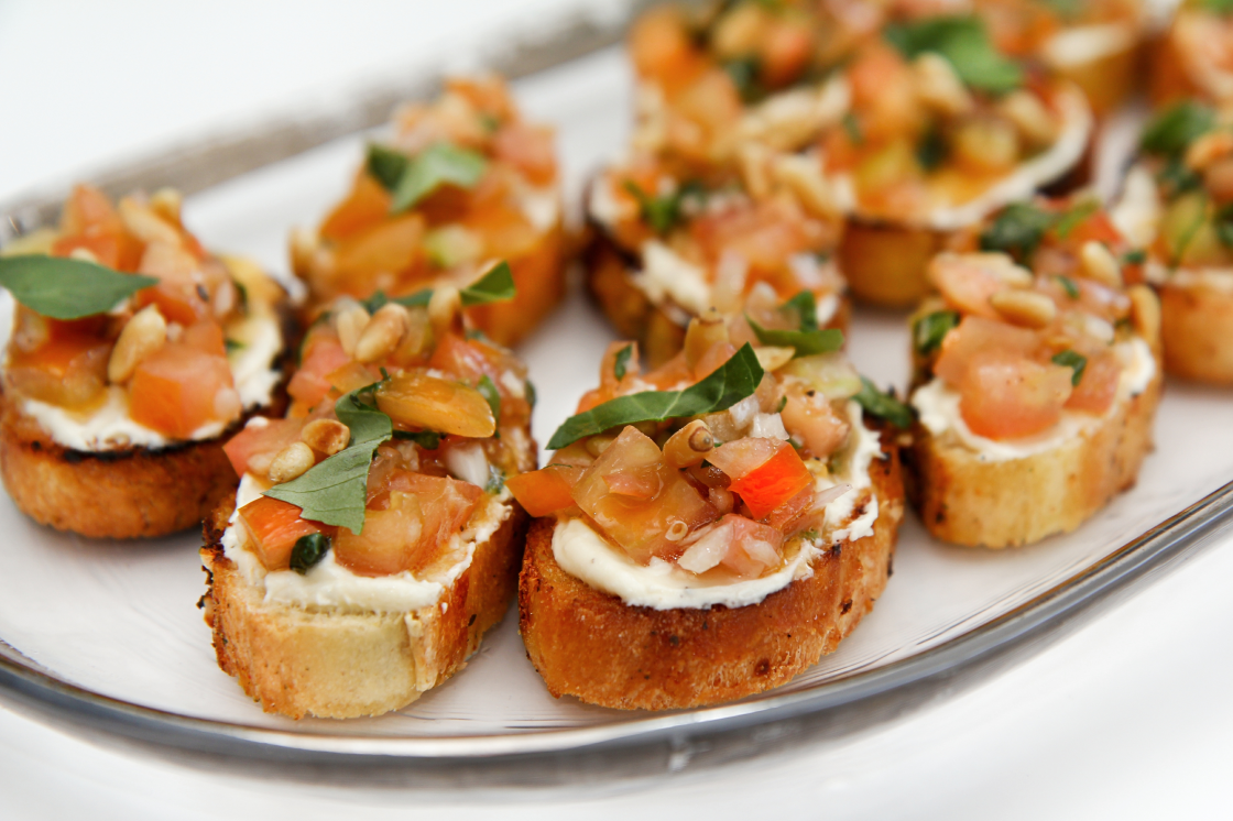Breiðið vel af fetaostkreminu á ristaðar baquettesneiðarnar og setjið þar á eftir tómatmaukið yfir. Leggið sneiðarnar á diska og stráið ristuðu furuhnetunum og ferskri basiliku yfir.