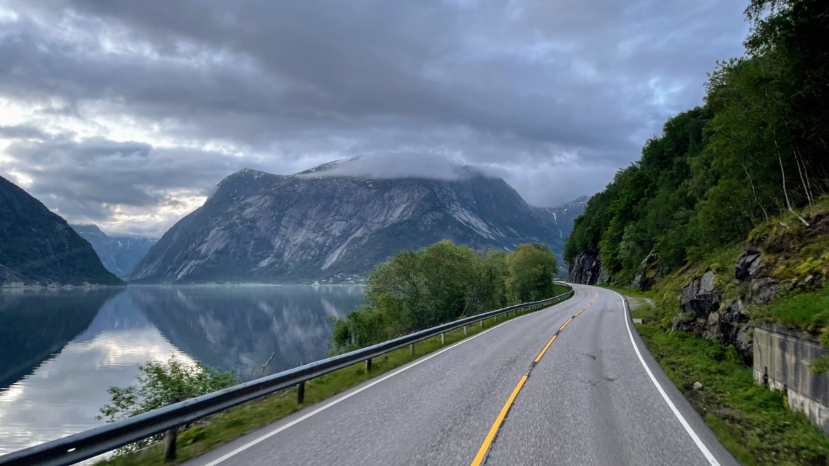 Myndin hér að ofan er tekin í firðinum Eidfjord í fylkinu Vestland í Noregi, klukkan 04:19 að staðartíma laugardagsmorguninn fjórða júní í ár.