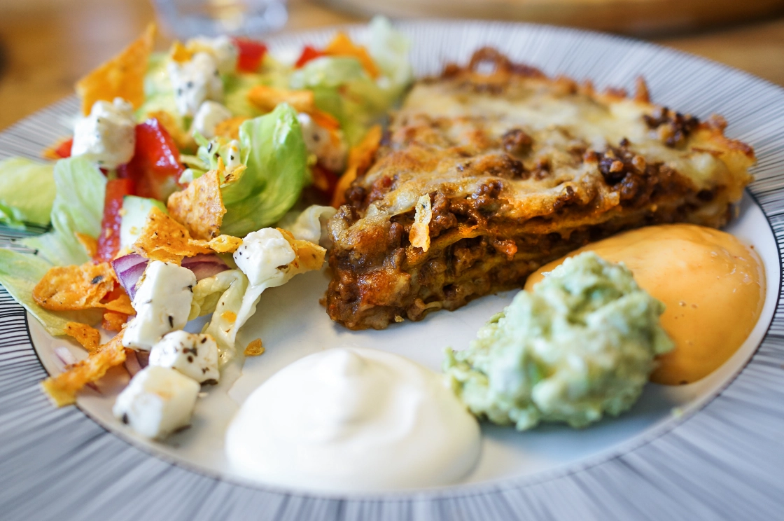 Setið tortillaköku á bakpappírsklædda ofnskúffu. Það getur verið gott að nota bontlaust springform (þ.e. bara hliðarnar) til að halda utan um kökurnar. Smyrjið 1/3 af nautahakkinu yfir tortillakökuna, setjið 1/3 af rifna ostinum yfir og leggið næstu tortillaköku ofan á. Endurtakið og endið á rifnum osti. Setjið tortillakökuna í ofninn og bakið þar til osturinn er bráðnaður, 15-20 mínútur.