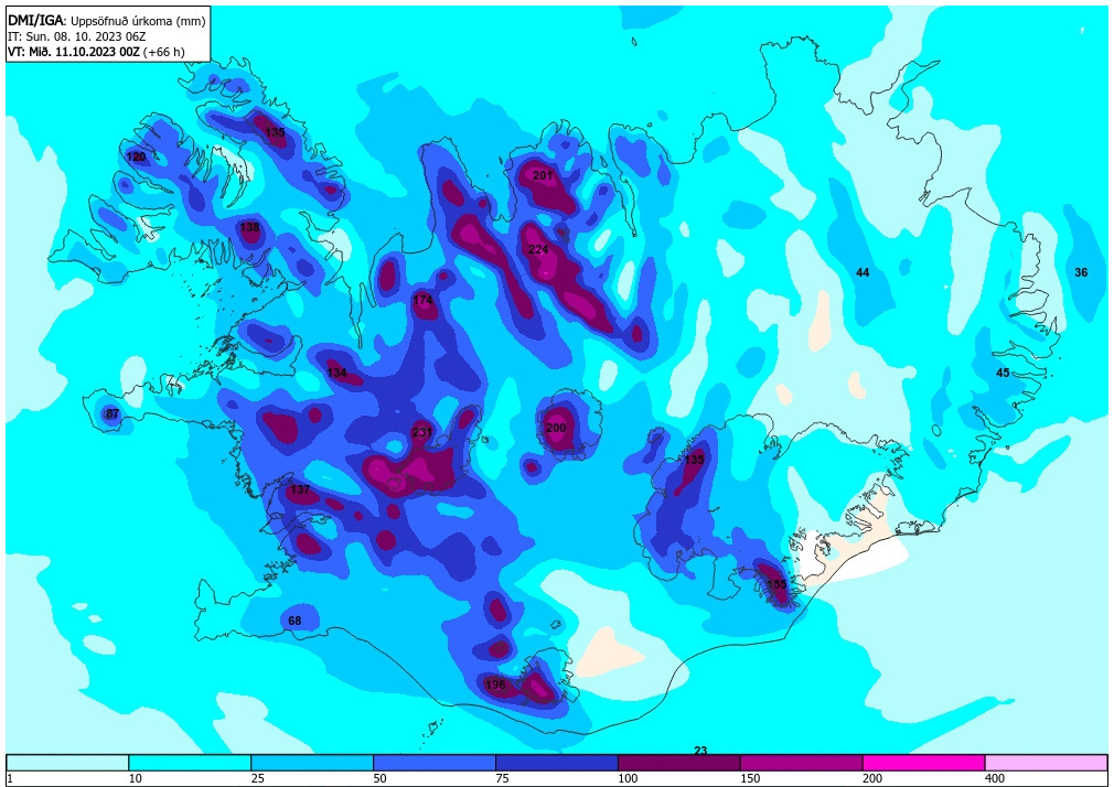 Samkvæmt veðurspá verður uppsöfnuð úrkoman mest á Norðurlandi og Vesturlandi fram á miðnætti á mánudag. Veðurspá gerir ráð fyrir 3-9° hita á láglendi og því gæti slyddað efst í fjallstoppa. Spáin gerir svo ráð fyrir því að það farni að kólni og að hiti verði nálægt frostmarki víða á láglendi.