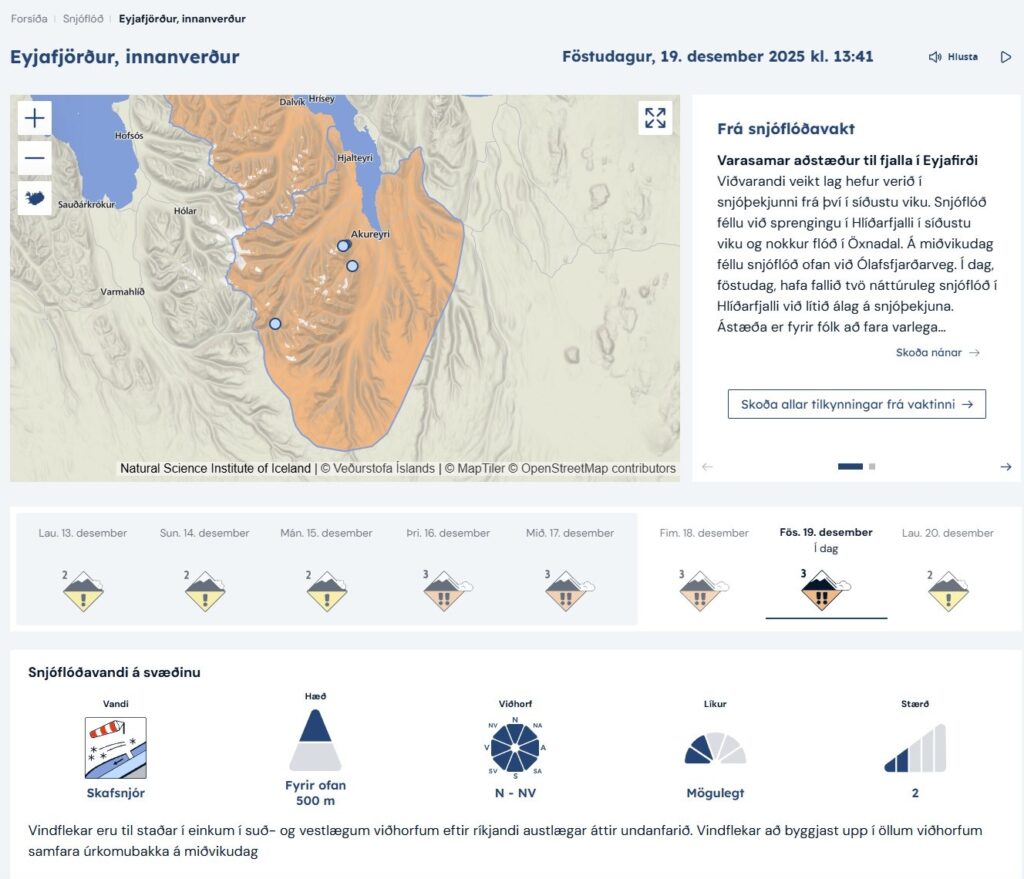 Á laugardag hlýnar og geta þá fallið náttúruleg snjóflóð. Þegar kólnar aftur ætti snjóþekjan að styrkjast en veik lög geta þó enn verið til staðar, sérstaklega ofan til í fjöllum.