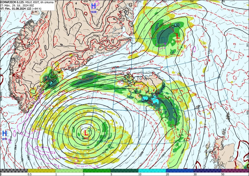 Veðurkortin 4 sem fylga eru úr miðnæturkeyrslu Evrópsku reiknimiðstöðvarinnar 29. júlí. Þau eru fengin af Brunni Veðurstofunnar. Það fyrsta á fimmtudag og síðasta á sunnudag. Öll hafa þau gildistíma kl. 12 á hádegi.