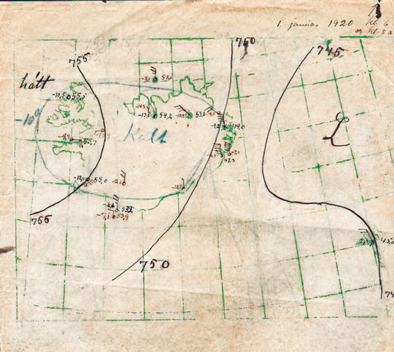 Á forsíðumynd má sjá veðurspá frá því herrans ári 1920.