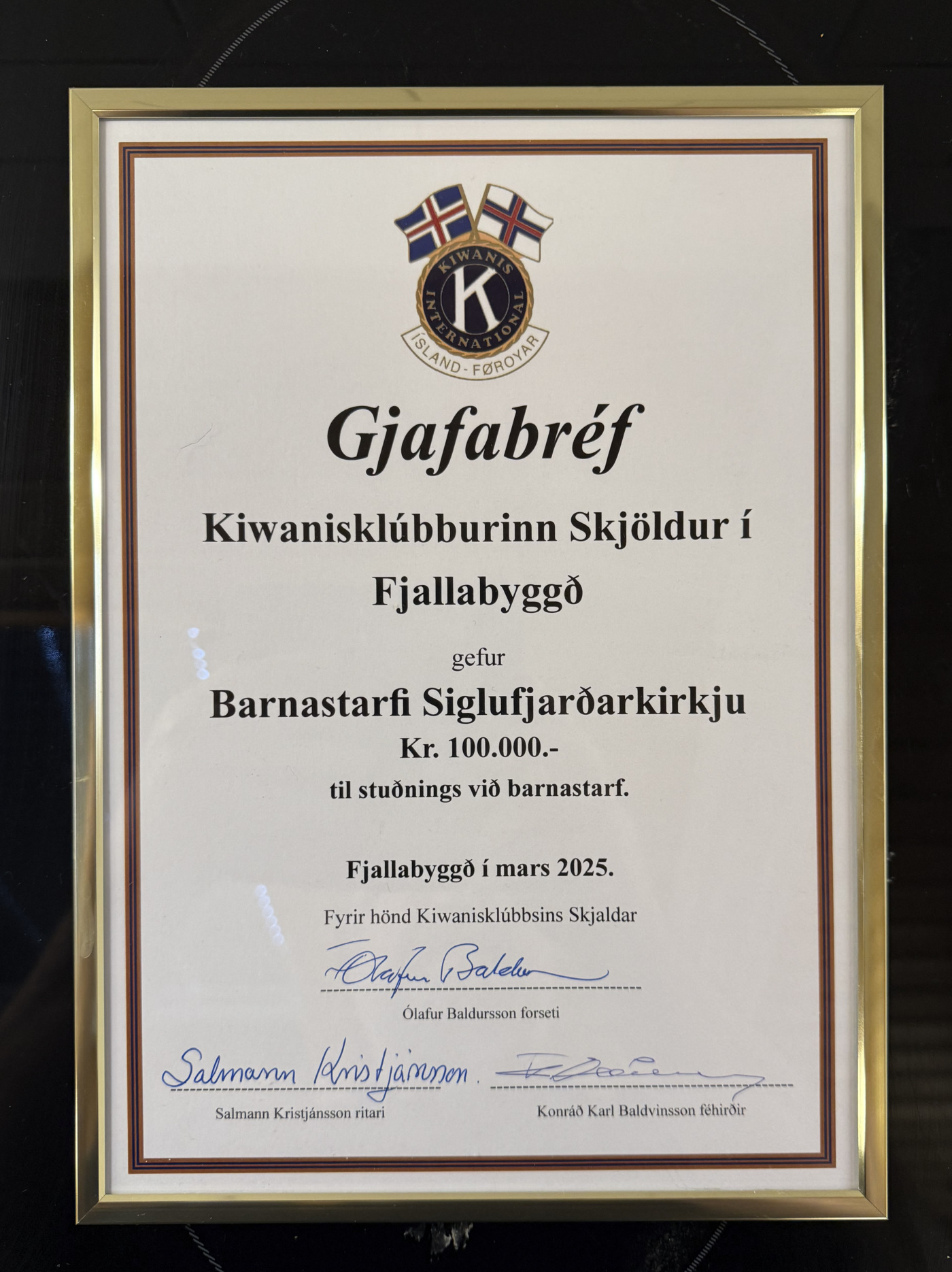 Á því varð engin undantekning í vor, nánar tiltekið 16. mars, á síðasta degi vetrarstarfs kirkjuskólans, en þá færði Kiwanisklúbburinn Skjöldur honum 100.000 krónur að gjöf.