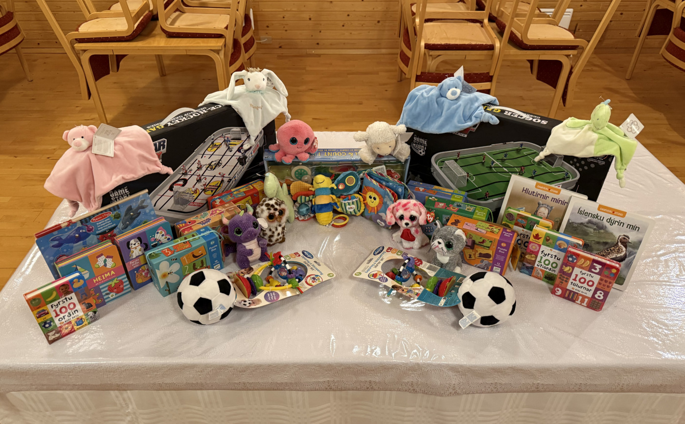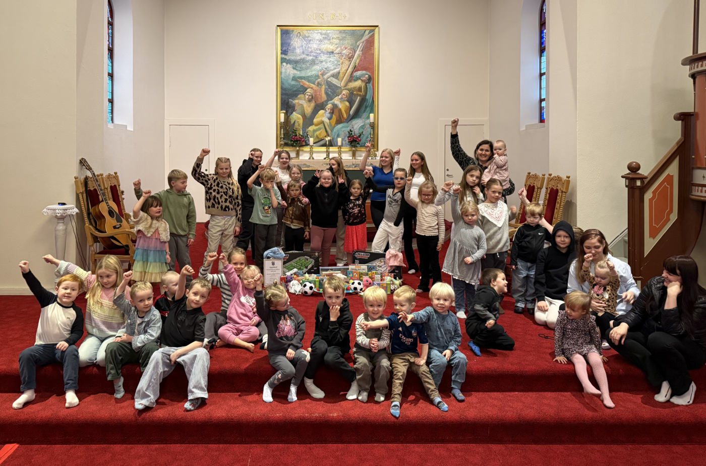Börnin, sem mætt voru í gær í kirkjuskólann fögnuðu að vonum og stilltu sér upp til myndatöku í kringum nýja dótið.