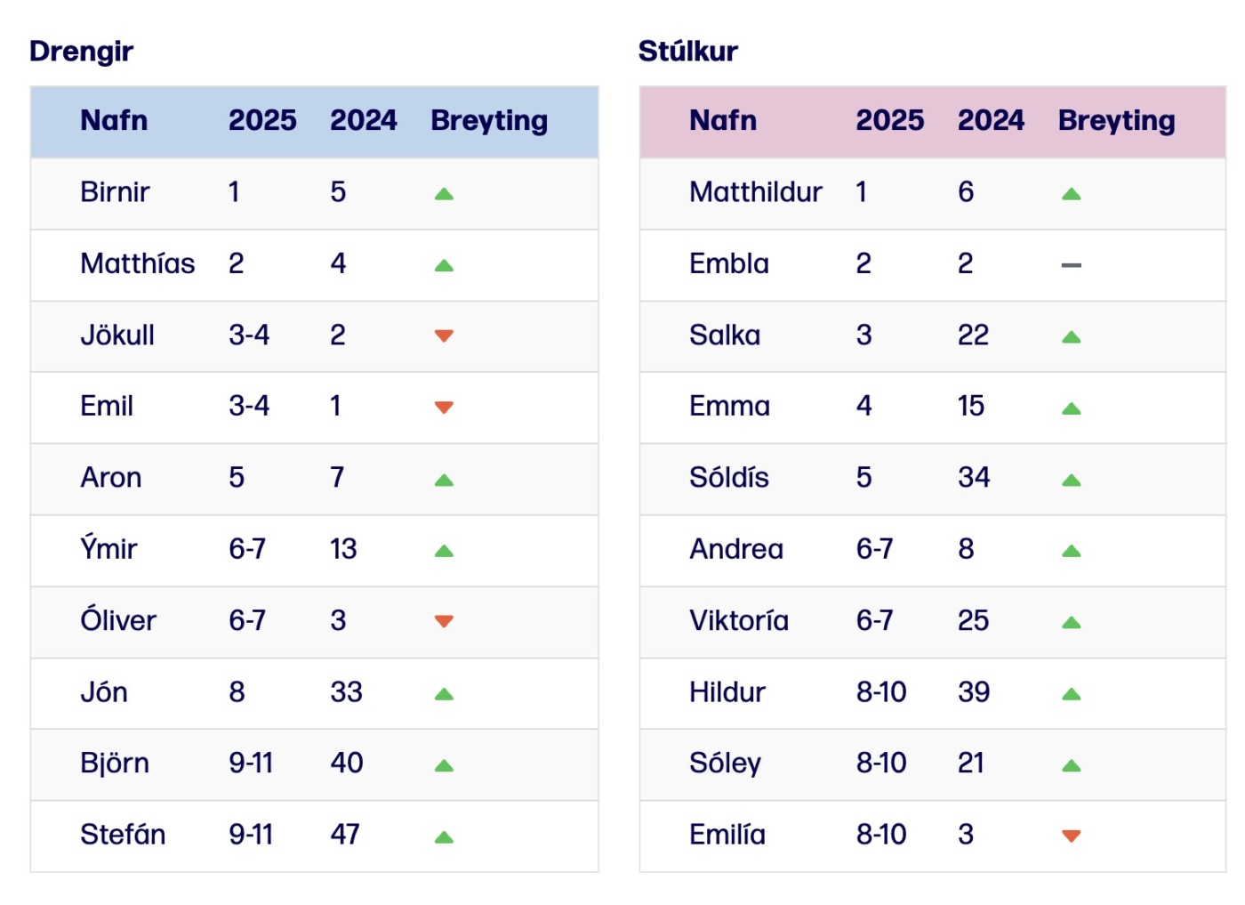 Hvað stúlkurnar varðar má sjá að stúlkunafnið Matthildur tekur fyrsta sætið af Aþenu og hækkar sig um 5 sæti frá fyrra ári. Hástökkvari á topp 10 listanum er nafnið Hildur sem stekkur úr 39. sæti í sæti 8-11.