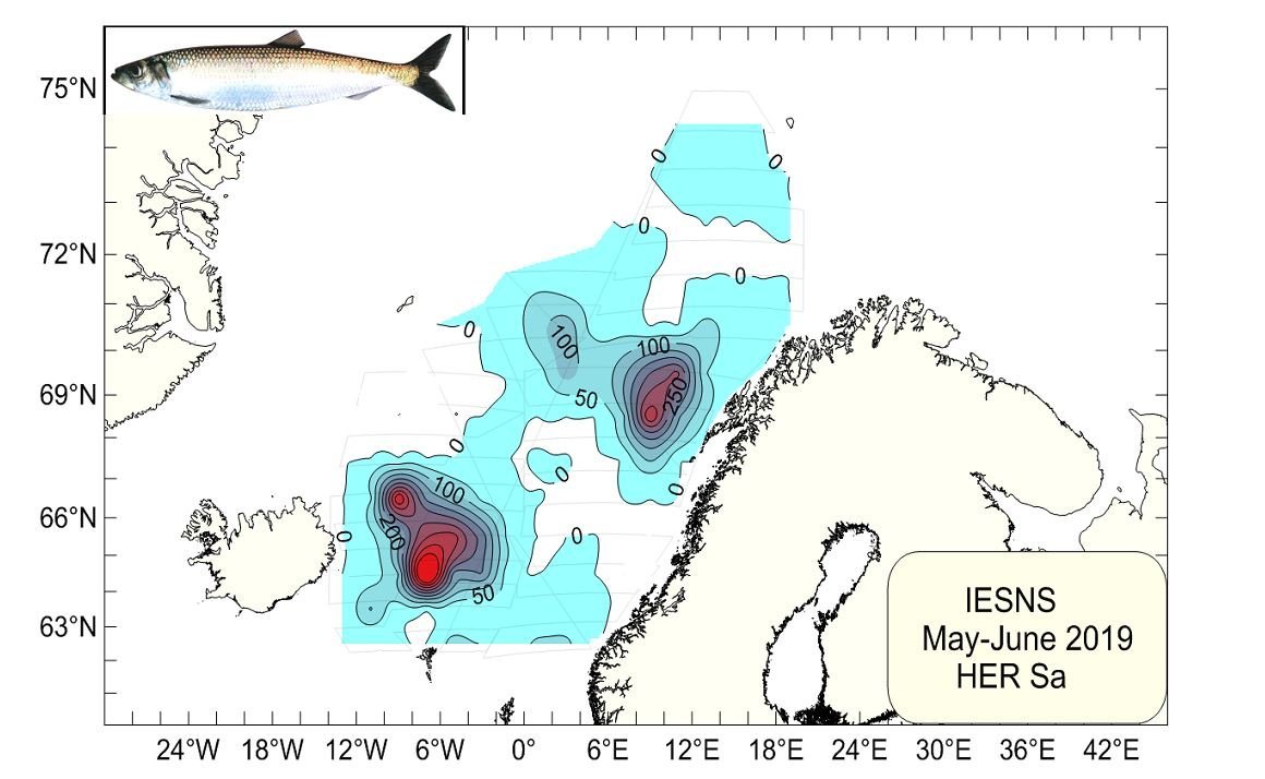 Útbreiðsla norsk-íslenskrar síldar var svipuð og undanfarin ár. Um 2/3 hluta lífmassans var að finna suðvestantil í Noregshafi (Austurdjúpi) en þriðjungur austar og norðar (mynd 1). Stærsta og elsta síldin hafði að öllu jöfnu gengið lengst í vestur en yngri síld var að finna austar og norðar. Heildar bergmálsvísitala fullorðinnar síldar var 4,9 milljón tonn sem er um 3% lækkun frá árinu 2018.
